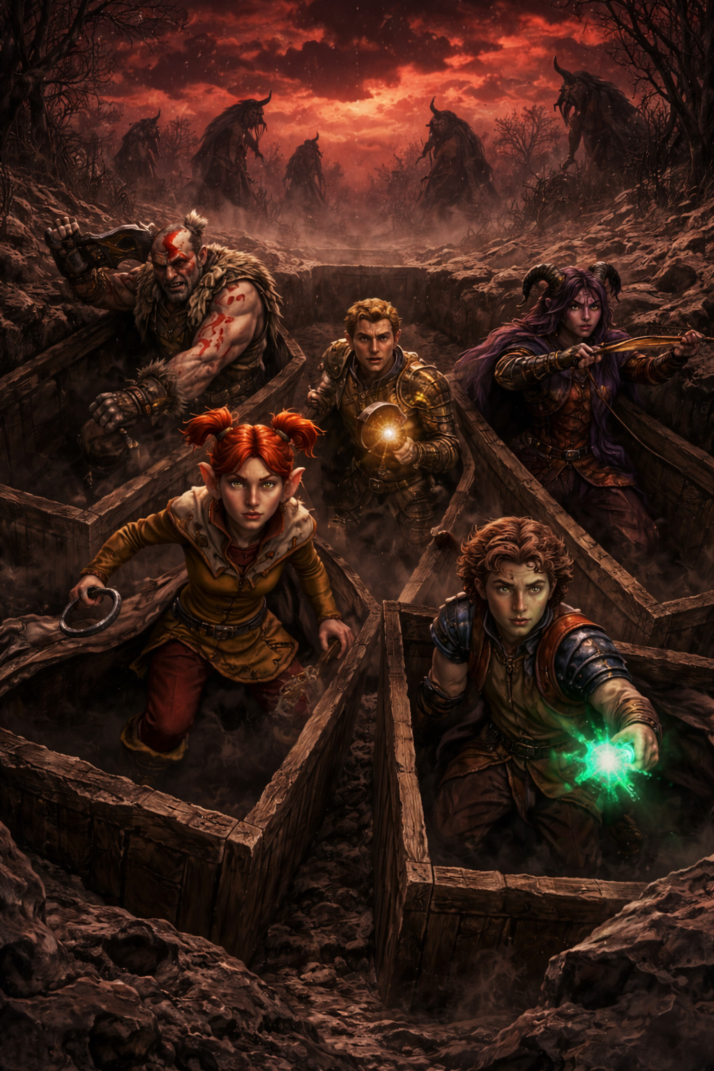 Sie erwachten in offenen Särgen, umgeben von kaltem Stein. Über ihnen spannte sich ein Himmel aus Asche, durchzogen von rötlichem, fremdartigem Licht. Kein Wind, kein Vogelruf – nur ein dumpfes, beunruhigendes Klopfen, das aus der Nähe zu hören war.